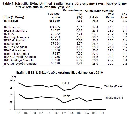 2010 yılı verilerine göre ortalama ilk evlenme yaşı erkekler için 26,5, kadınlar için 23,2’dir. Erkek ile kadın arasındaki ortama ilk evlenme yaş farkı 3,3’tür. Bölgesel düzeyde en yüksek ortalama ilk evlenme yaşı, erkeklerde 27,4, kadınlarda 24,3 ile İstanbul Bölgesi’nde görülmektedir. En düşük ortalama ilk evlenme yaşı ise erkeklerde 25,3, kadınlarda 21,8 ile Orta Anadolu Bölgesi’ndedir.