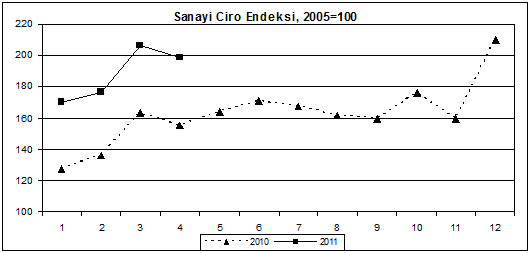 Sanayi Üretim Anketi kapsamında yer alan İmalat Sanayi ile Madencilik ve Taşocakçılığı kısımlarında bulunan işyerlerinden 2005=100 temel yıllı oluşturulan Sanayi Ciro Endeksi, 2011 yılı Nisan ayında bir önceki yılın aynı ayına göre %27,8 artmış, bir önceki aya göre ise % 3,6 azalmıştır.