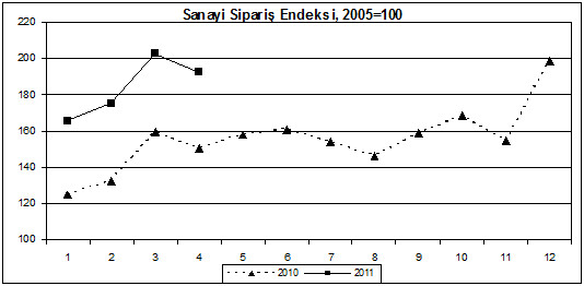 Avrupa Birliği düzenlemelerine göre, İmalat Sanayi kısmında sipariş ile çalışan faaliyetlerde bulunan ve Sanayi Üretim Anketi’nin kapsamına giren işyerlerinden, 2005=100 temel yıllı oluşturulan Sanayi Sipariş Endeksi, 2011 yılı Nisan ayında bir önceki yılın aynı ayına göre %27,7 artmış, bir önceki aya göre ise %5,3 azalmıştır.
