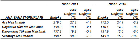 Ana sanayi grupları sınıflamasına göre 2011 yılı Nisan ayında en yüksek artış Sermaye Malı İmalatında görülmüştür.