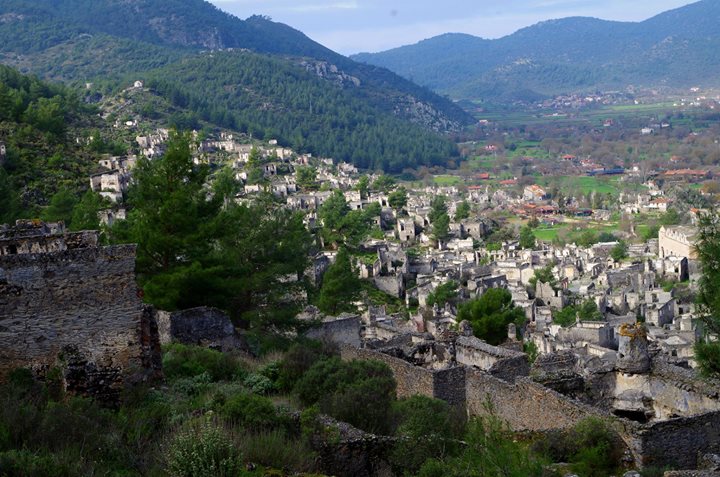 2-3 gün önce Meltem ve Mesut ile birlikte Kayaköy’e gittik. Çok eski dönemden kalma bir köy burası. Bazı evler harabeye dönmüş ama birçoğu hala sağlam. Mutlaka görmenizi tavsiye ettiğim bir yer burası. Tepeye kadar tırmandık. Dağın eteklerine kurulmuş ve çok güzel yemyeşil bir ovaya bakıyor bu antik köy. Arkasını ise tamamen ormana dayamış.