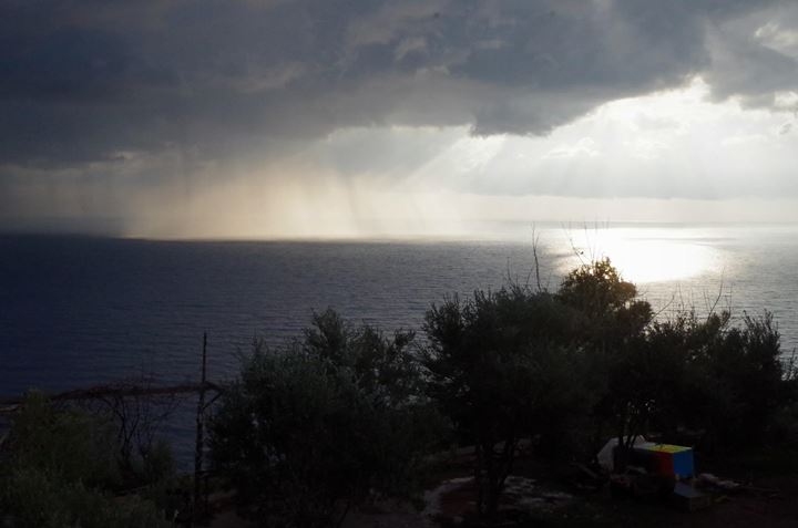 Deniz üzerinde yağmurun başlamasıyla sert bir ışık kırılması oluştu. Uzaktan yağmuru izliyoruz. Fotograf: Ozan Bugdaycı / The Epochtimes