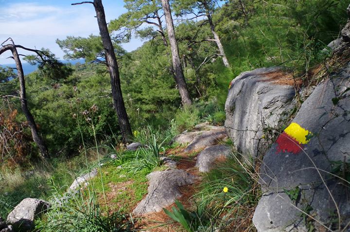 Bugün Özgürün tavsiyesi ile koy tarafına doğru değil de, diğer tarafa doğru yürüyüşe çıktım. Sadece bizim bulunduğumuz noktadan bile 7 ayrı yürüyüş hattı varmış. Yürüyeceğim patika yüzlerce kilometrelik Likya yolunun çok küçük bir parçası. Patika boyunca kayalar sarı kırmızı boyanmış. Evin önündeki dik yokuştan aşağı doğru 4-5 dakika indikten sonra, sağ tarafa doğru patikanın kıvrıldığını gördüm ve işaretli kayaları izlemeye başladım.