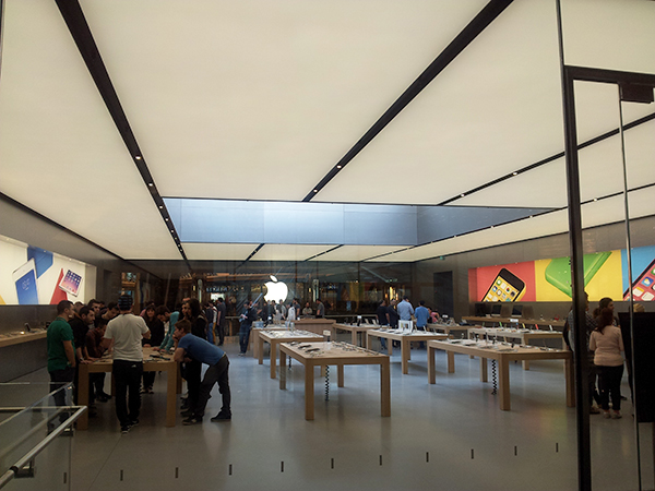 İki katlı Apple Store, etrafında kaplı camekanıyla çok ferah bir görüntü oluşturuyor.