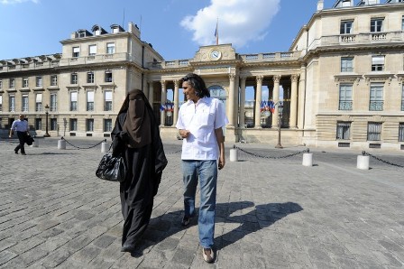 Ulusal Fransa Meclisinin önünde Fransız Rachid Nekkaz, kara peçeli bir bayanla yürürken (Mehdi Fedouach/AFP/Getty Images)