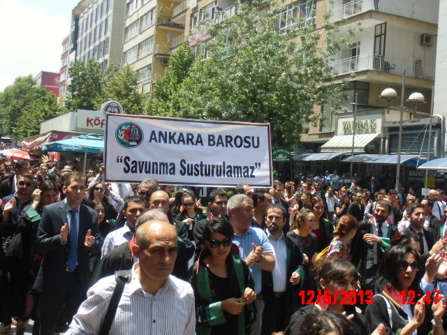 Ankara Adliyesi önünde toplanan avukatlar Atatürk bulvarı üzerinde Kızılay istikametinde trafiği kapatarak yürüdü. Avukatlar ‘, ‘Savunma susturulamaz’, ‘Acil demokrasi’, ‘Adalet istiyoruz’ pankartlarıyla yürüdü. Avukatlar, ‘Her yer Taksim, her yer direniş’, ‘Diktatör istifa’ , Ankara korkma avukatın yanında ‘sloganları attı. Avukatların trafiği kapatması üzerine polis ekipleri Kızılay çevresinde güvenlik önlemi aldı. Avukatlar Kızılayda Güvenparka yürümek istedi. Fakat Bir TOMA’nın üzerlerine yürümesi üzerine grup İzmir caddesine yöneldi. Avukatlar ve halk Kızılaydan geçerken orda bulunan TOMA aracını yuhaladı. Daha sonra Gazi Mustafa Kemal Bulvarından İzmir Caddesine geçen avukatlara halk alkışlarıyla destek verdi. Eski Danıştay Parkı yanında bulunan Baro’ya ait kültür merkezi önünde toplanan avukatlar burada bir basın açıklaması yaptı.