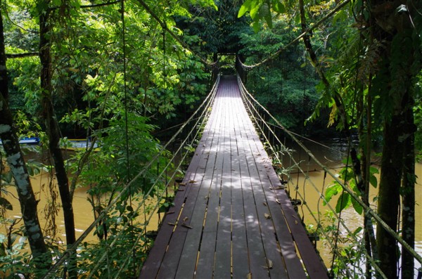 Park sınırlarına girebilmek için, önce nehri aşmanız gerekiyor. O yüzden nehrin üzerine, yandan halatlarla gerilmiş ve 20 kişi taşıma kapasiteli bir asma köprü yapmışlar. Köprüyü geçerek içeri giriyorsunuz. Yürürken sarsılan köprünün üzerinde yürümek bile çok zevkli.