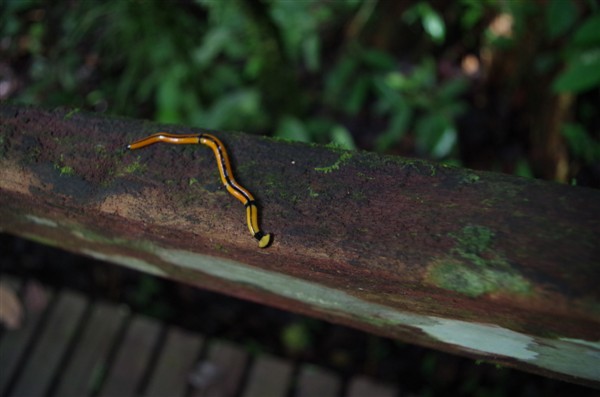 Ortalık orman kuşlarının ve böceklerin sesiyle yankılanıyor. Resmen konser var içerde. Çok bahsetmişlerdi fakat elektronik müzik yapan kuşları ilk defa dinliyorum. Bildiğiniz dijital sesler var burada. Bazıları o kadar komik ki, duyan herkes bir anda gülmeye başlıyor. İnanılmaz bir yaşam var burada. Devasa yapraklı bitkiler her yerden fışkırmış ve sarmaşıklar dev ağaçları sarıp sarmalamışlar. Hava nemli ve ağaç yaprakları ve gövdeleri de nemli veya ıslak. Orman resmen fosforlu bir yeşil yayıyor. Çok şık ahşap köprüler yapmışlar ve nehirleri aşıyorsunuz yol boyunca. Dünyanın en eski ekolojik sistemlerinden birisi burası. Binlerce kuş, böcek çeşidi yaşıyor. Yol boyunca ilerlerken yağmur ormanlarına has olan o ilginç böcek ve hayvanlara karşılaşıyorsunuz. ilk gördüğüm hayvan bir karıncaydı. kolaylıkla seçilebiliyordu çünkü kendisi neredeyse 2 cnm uzunluğundaydı. Küçücük, yaklaşım 1 cnm uzunluğunda neredeyse cam gibi şeffaf bir mantarın etrafında dolanıyordu.