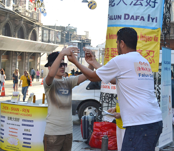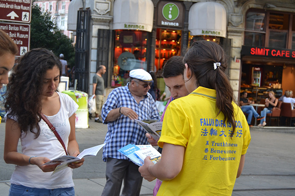 20 Temmuz 2014 Pazar günü saat 14.00’de Beyoğlu Tünel’de toplanan Falun Dafa uygulayıcıları, her gün yerli yabancı binlerce insanın akın ettiği Taksim’de düzenledikleri faaliyet ile insanlara Falun Dafa’yı (aynı zamanda Falun Gong olarak da bilinir) ve beş takımdan oluşan yumuşak ve huzur dolu egzersizlerini tanıttılar. Uygulayıcıların astığı “Falun Dafa İyi” ve “Dünyanın Doğruluk-Merhamet-Hoşgörü’ye İhtiyacı Var” yazılı afişler meydanda bulunan birçok kişinin dikkatini çekti. Uygulayıcıların egzersizlerinden ve huzurlu görüntüsünden etkilenen birçok kişi egzersizleri öğrenmek ve uygulama alanları hakkında bilgi almak istedi. Türkler kadar yabancı turistlerinde yoğun ilgi gösterdiği faaliyet sırasında birçok farklı dilde bilgi materyalleri dağıtıldı. Ayrıca birçok Çinli turist de uygulayıcılara desteklerini ifade etti ve gülümseyerek uygulayıcıların dağıttığı materyallerden aldı.