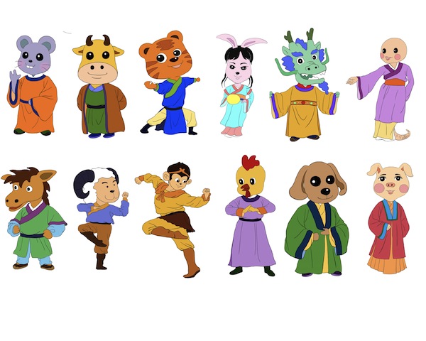 Bu 12 hayvan burçları fare, öküz, kaplan, tavşan, ejderha, yılan, at, koyun, maymun, horoz, kopek ve domuzdur.