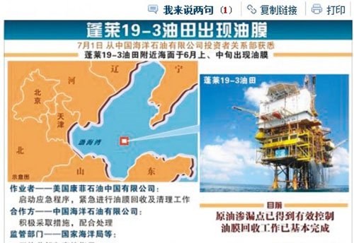 Çin otoriteleri sonunda Bohai Denizi’nde bulunan Penglai 19-3 petrol yatağından petrolün dışarı sızdıklarını kabul ettiler. Petrol sızıntısı ilk önce Economy & Nation Weekly’e göre Haziran ortasında tespit edildi ama haberler kamudan saklandı.