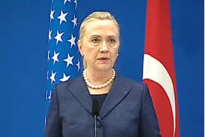 A.B.D.Dış İşleri Bakanı Clinton ise, İstanbul’da olmaktan duyduğu memnuniyeti ifade etmesinin ardından 2 gün önce Türk askeri otobüsüne gerçekleştirilen hain PKK saldırısında yaralanan ve ölen Türk askerleri için duyduğu üzüntüyü ifade ederek konuşmasına başladı. Bir ay önce Paris’te gerçekleştirilen Suriye’nin Dostları toplantısından bu yana krizin derinleştiğini söyleyen Clinton, muhalefetin kazandığı güce karşılık Suriye yönetiminin artan bir şiddetle bu güçlenmeye cevap verdiğini ve rejimin daha önceki destekçilerini kaybettiğini ve Suriye’nin yüksek kademeli bir çok yetkilisinin de görevi bıraktığını söyledi. BM Genel Kurulu’nun ezici bir çoğunlukla Esad rejimini kınayan ve barışçıl ve politik bir geçişe çağrıda bulunduğu kararını geçirdiğini ama Rusya ve Çin’in Güvenlik Konseyi’nde atılması gereken adımları engellediğini söyledi. Türkiye ile bir araya gelerek uluslar arası ortaklar ile birlikte Suriye içindeki ve dışındaki müttefiklerle neler yapabileceklerini görüşmek için bir araya geldiklerini söyleyen Clinton, görüşmede üç öncelikli konuyu görüştüklerini söyledi. Birinci konunun muhaliflere vahşeti sona erdirmek ve politik bir geçişi sağlamak için destek vermek olduğunu söyleyen Clinton, Esad olmadan özgür ve demokratik bir geçişin sağlanması niyetinde olduklarını söyledi. A.B.D.’nin hala muhaliflere iletişim desteği ve öldürücü olmayan destek ve ekonomik destek sağladığını söyleyen Clinton, değişik türdeki yardımlarda bulunan taraflarla da ortak çaba içerisinde olduklarını dile getirdi. Türkiye ve Amerika gruplarının muhalefete verdikleri destek konusundaki notları da paylaştıklarını söyleyen Clinton, ortak bir operasyonel resim yaratmaya ve şiddetin sona erdirmek konusunda kararlı olan diğer taraflarla birlikte iş birliğini kuvvetlendirmeye çalıştıklarını ifade etti. Suriye’deki muhalefete de dışarıdan yaptıkları baskıyı güçlendirerek destek olduklarını söyleyen Clinton, Washington’un da İran-Hizbullah-Suriye arasındaki bağları koparmak için bir takım yaptırımlar uyguladıklarını söyledi. İkinci olarak da ne kadar Esad’ın düşmesini isteseler de aynı zamanda Esad’ın ortaya çıkardığını ifade ettiği insani krize de acil bir çözüm bulmak için çabalarını söyleyen Clinton, Suriye’de yaklaşık 2.000.000 insanın yardıma ihtiyacı olduğunu ve yaklaşık 140.000 kişinin de Suriye’den dışarı katçığını ifade etti. Türkiye halkına ve devletine de mültecilere gösterdikleri misafirperverlik için de teşekkür etti. Son olarak da Clinton terör konusunda ve PKK konusunda da Türkiye ile tam bir işbirliği içinde hareket edeceklerini söyledi.