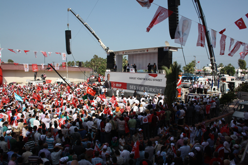 MHP lideri Devlet Bahçeli Mersin’de Tevfik Sırrı Gür Stadyum’u önünde halka seslendi. Kalabalık bir dinleyici kitlesine seslenen Devlet Bahçeli Başbakan Erdoğan’ın iktidarı boyunca kendisine uygun bir mutlu azınlık yarattığını ve bir lale ve sülale devri başlattığını ve kendisine oy veren vatandaşlar başta olmak üzere ülkeyi yoksulluğa ittiğini söyledi. Konuşmasında pekçok konuya değinen Bahçeli:”AK Parti’nin gitme vakti gelmiştir. AK Parti’nin 3. dönem iktidar olması, ülkemiz için en büyük talihsizlik olur. Çünkü AK Parti tükenmiştir, AK Parti bitmiştir. AK Parti’nin yapacağı hiçbir şey kalmamıştır. AK Parti, milletimizin kendisine vermiş olduğu büyük fırsat ve imkanı kullanamamıştır” dedi.