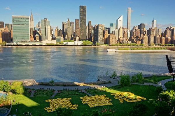 Tayvanlı uygulayıcılar Birleşmiş Milletler binası karşısında, Hudson nehri çevresinde Zhen, Shan, Ren yani “Doğruluk, Merhamet, Hoşgörü” anlamına gelen insanlardan oluşan Çince dev bir yazı çizdiler.