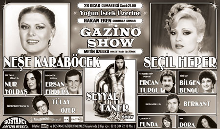İlk kez geçtiğimiz Aralık ayında izleyici karşısına çıkan ve gişe rekoru kıran “Gazino Show”, yoğun ilgi ve istek üzerine, bir kez daha, 28 Ocak Cumartesi gecesi Bostancı Gösteri Merkezi’nde!