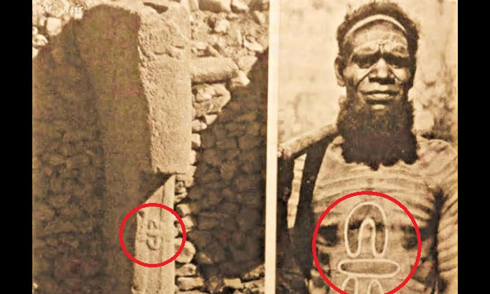Örneğin bu makalenin başındaki fotoğraf, Göbekli Tepe’deki bir sütun üzerindeki bir sembolle, bir Avustralyalı Aborijin yaşlı adamın göğsünde boyanmış halde aynı sembolü göstermektedir. Bu simge Aborijinler tarafından, birbirine bir şeyler anlatmak için oturmakta olan iki kişiyi tasvir etmek amacıyla kullanılmaktadır.