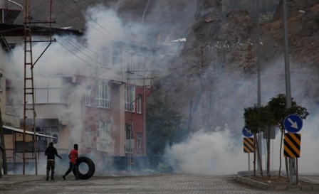 Hakkari- Van Karayolu’na toplanan yüzü maskeli göstericiler ellerindeki taş ve Molotoflarla yoldan geçen araçları durdurarak kimlik kontrolü yaptılar. Bunun üzerine olay yerine sevk edilen polis zırhlı araçlarıyla göstericilere gaz bombası sıkılarak müdahale edildi.Göstericiler de yüksek yerlere kaçarak, taş atarak polise karşılık verdi.