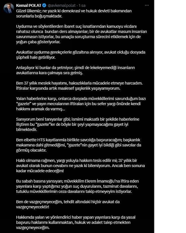 İBB Başkanı Ekrem İmamoğlu’nun avukatı Kemal Polat, “Yalan haberlerine karşı, onlarca dosyada müvekkillerimi savunduğum bazı ‘gazete’ ve yayın mecralarının iftiraları için bu sefer yargı önünde kendi hakkımı aramak da varmış” diyerek açıklama yaptı. Polat sosyal medya hesabı üzerinden bir açıklama yaptı.