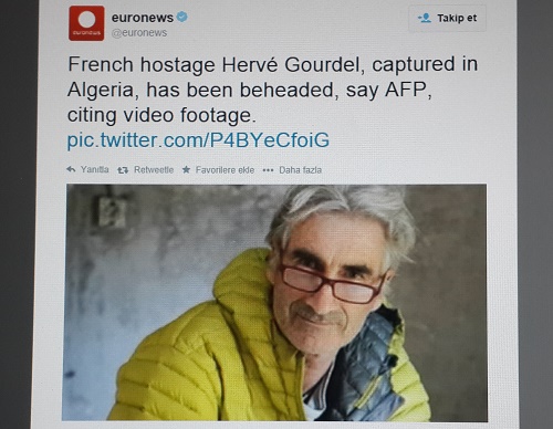 Cezayir’de IŞİD’e bağlı terör örgütü Jund el-Khilafa, (Halife’nin askerleri) kaçırdığı Fransız rehine Herve Gourdel’i başını keserek öldürdü.