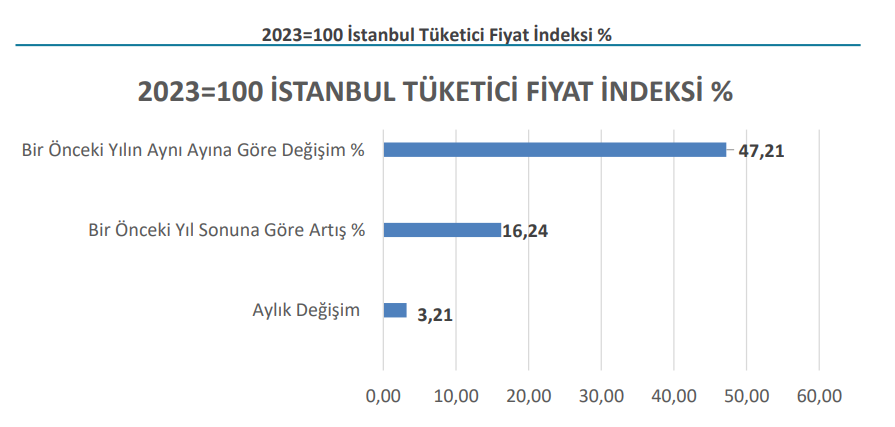 2025 Nisan ayında İstanbul’da; perakende fiyat hareketlerinin göstergesi olan İstanbul Ücretliler Geçinme İndeksi bir önceki aya göre yüzde 3,21 arttı. Yıllık bazda artış ise yüzde 47,21 olarak gerçekleşti.