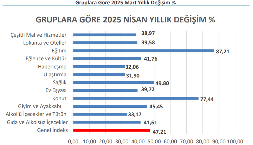 Nisan ayında İstanbul Tüketici Fiyat İndeksinde; bir önceki aya göre giyim ve ayakkabı harcamaları grubunda yüzde 13,59, konut harcamaları grubunda yüzde 6,66, haberleşme harcamaları grubunda yüzde 5,22, ulaştırma harcamaları grubunda yüzde 3,93, ev eşyası harcamaları grubunda yüzde 3,74, lokanta ve oteller harcama grubunda yüzde 3,15, çeşitli mal ve hizmetler harcama grubunda yüzde 3,12, alkollü içecekler ve tütün harcamaları grubunda yüzde 2,29, sağlık harcamaları grubunda yüzde 2,13, eğlence ve kültür harcamaları grubunda yüzde 2,03, gıda ve alkolsüz içecekler harcama grubunda yüzde 1,57 artış olurken, eğitim harcamaları grubunda değişim olmadı.