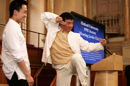 Jackie Chan 2008 yılında Oxford Üniversitesi’nde bir konuşma sırasında Kung Fu pozu verirken (Screenshot/takungpao.com)