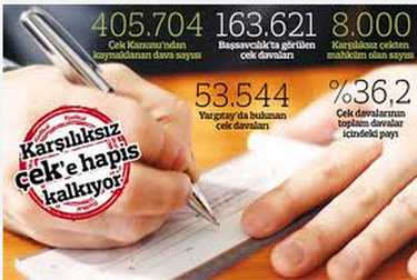 Karşılıksız çek verenler 150 bin lira para olarak çek cezasını ödeyecek. Çekin miktarı 150 bin liradan fazla ise verilen ceza da en az çek bedeli kadar olacak.