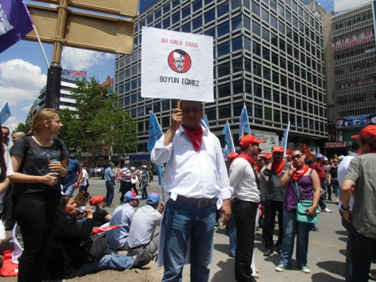 CIMG4352Eyleme bir çok meslek kuruluşunu temsilen vatandaşlar , kadın çocuk yaşlı genç katıldı. Eylemde Tabibler Birliği, devlet tiyatroları , eğitimciler , öğrenciler, memurlar , işçiler 75 milyon için   “Kamu yararının ortadan kaldırılmasına, kamu hizmetlerinin piyasalaştırılmasına, performansa göre ücretlendirmeye, esnek, güvencesiz, kuralsız çalışmaya, siyasi kadrolaşmanın son durağı ‘hükümet memurluğuna’, iş ve ücret güvencesininin adım adım ortadan kaldırılmasına karşı ‘insanca yaşam, güvenceli iş-güvenli gelecek, demokratik bir Türkiye’ için grevdeyiz” açıklaması yapıldı.