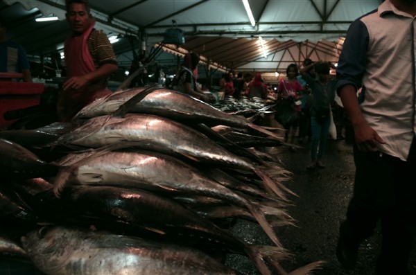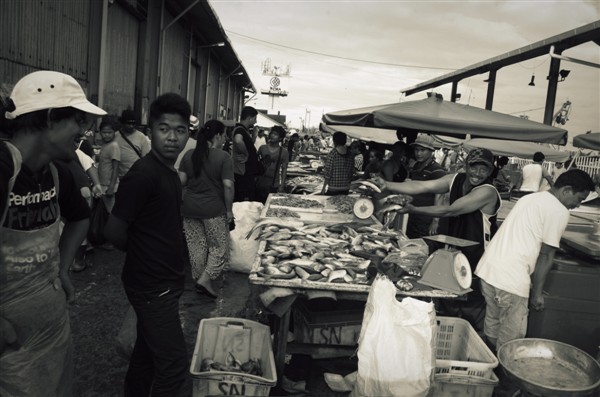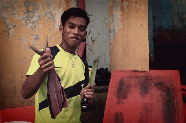 Sahilde yürümeye devam ettim, ilerde bir hareketlilik vardı merak edip sokuldum. Balık pazarı kuruluyor. Tabi koku feciiii ağır. Zaten ben, bizim normal balık pazarlarında bile yürüyemiyorum… Balık kokusu beni biraz rahatsız eder ama burada olayın boyutları aşılmış durumda, öyle ki ayağım birkaç kere kaydı ve kapaklanıyordum neredeyse çünkü yerlerde ölü balıklar var ve üzerlerine basılmaktan artık kağıt gibi olmuşlar, bazıları da dağılmış artık ve sabun gibi kaygan hale gelmişler. Koca koca balıkları doğruyorlar, yerlere kanlar akıyor, yağmur yüzünden zaten yerler ıslak sürekli….ortalık leş yani anlayacağınız. Katliam var resmen burada. Broker tipli elemanlar da, muhtemelen Çinlilerdir, sürekli balıkçıların başında not tutuyorlar. Kaç kasa geldi kaç kasa gitti hesabı… Balıkçı çocuklar da fotoğraflarını çekmem için şekilden şekle giriyor- pozlar falan o biçim. Fakat sağolsun, balık tezgahlarından birinde, adam tezgah yerine beni yıkamaya kalkışınca otele dönüp duş almak zorunda kaldım.