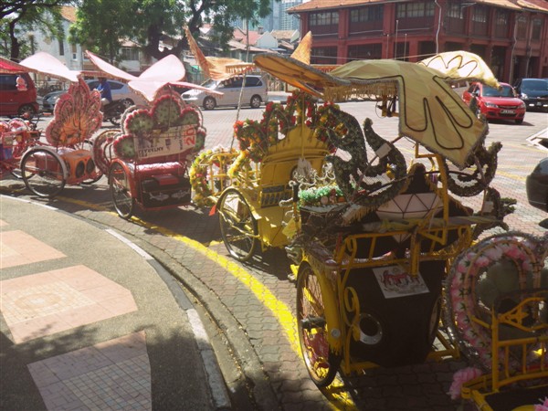 Melaka’da turistleri taşımak için led ışıklarla donatılmış bisikletler etrafta cirit atıyor. Bozuk hoparlörleri ile sokaklarda turistleri gezdiriyorlar. Şoförleri de pek havalı. Gece etrafta ışıl ışıl yanan bu bisikletler sokaklara renk katıyor.