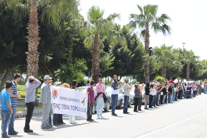 Bugün Mersin Nükleer Karşıtı Platformu çağrısı üzerine geniş çaplı bir eylem düzenlendi. Eyleme bir çok sivil toplum kuruluşları ve çevreciler ile yerel halk katıldı. Mersin Merkez Atatürk Parkı’ndan santralin yapılacağı Gülnar’ın Büyükeceli Belde’sine ait Akkuyu’ya kadar 30 farklı noktada buluşan onbinlerce kişi 159 kilometrelik bir alanda insan zinciri oluşturuldu.