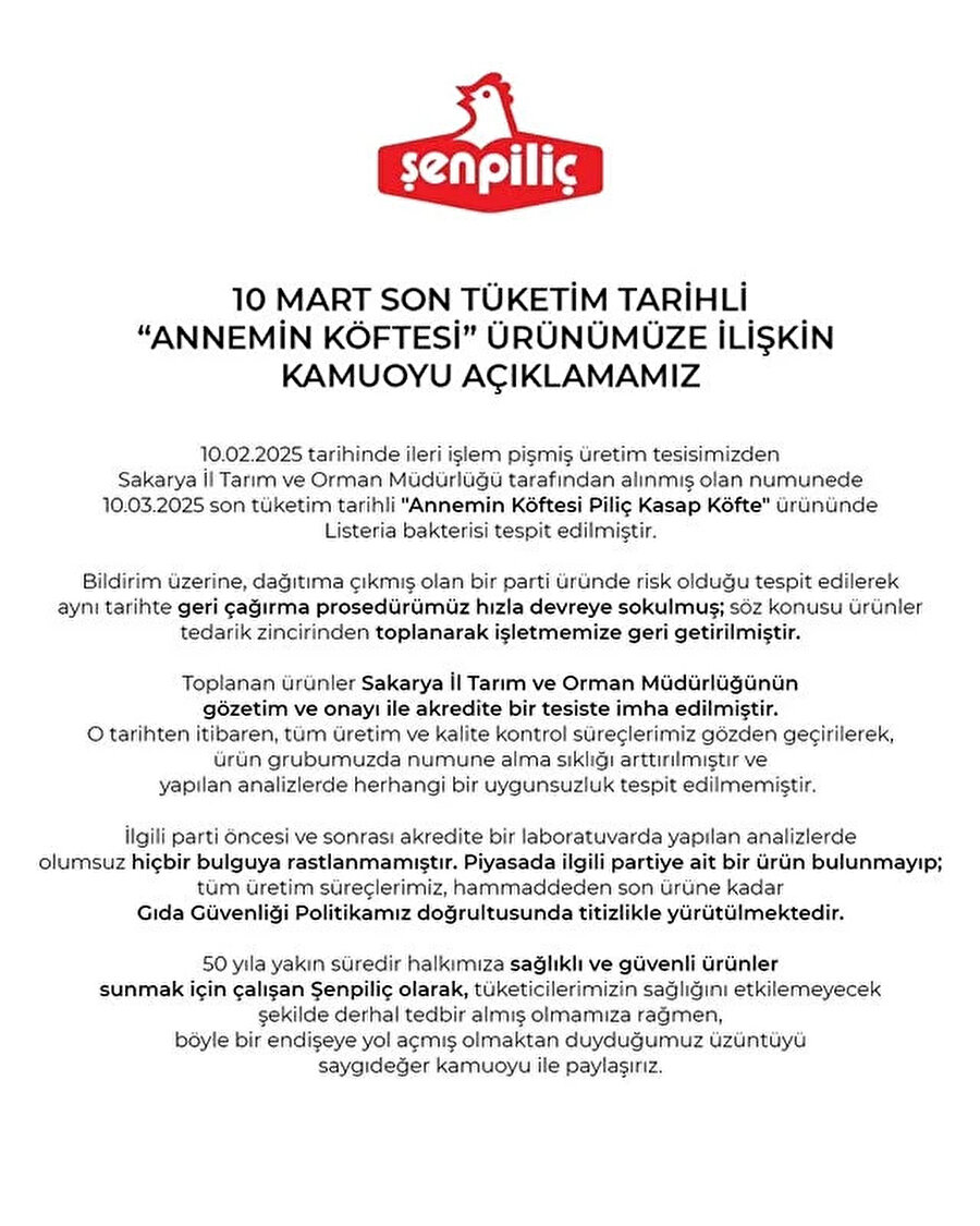 “10.02.2025 tarihinde ileri işlem pişmiş üretim tesisimizden Sakarya İl Tarım ve Orman Müdürlüğü tarafından alınmış olan numunede 10.03.2025 son tüketim tarihli “Annemin Köftesi Piliç Kasap Köfte” ürününde Listeria bakterisi tespit edilmiştir.