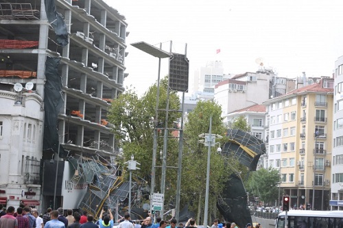 Taksim’de fırtına nedeniyle 10 katlı bir inşaatın iskelesi çöktü. Olayda 6 kişi hafif yaralanırken, 10 araç iskelenin altında kaldı.
