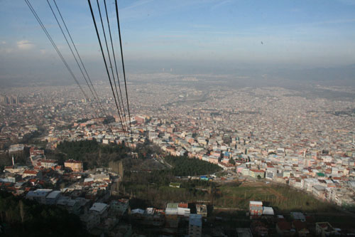 Teleferiğe biniyorsunuz sonra ve başlıyorsunuz Uludağ’a doğru çıkmaya. Yüzünüz şehre arkanız dağlara dönük. Bakıyorsunuz o sokaklarında gezerken sizi şaşkına çeviren şehir şimdi üzerine kara bir bulut gibi çökmüş bir sis tabakası ile kaplı bir şehir olmuş. Artık Bursa bir sanayi şehri, havası rüzgarlarla temizlenen. Ovaya kayıyor gözleriniz hüzünlüce.