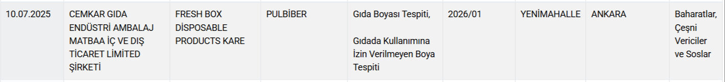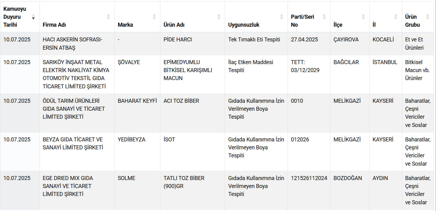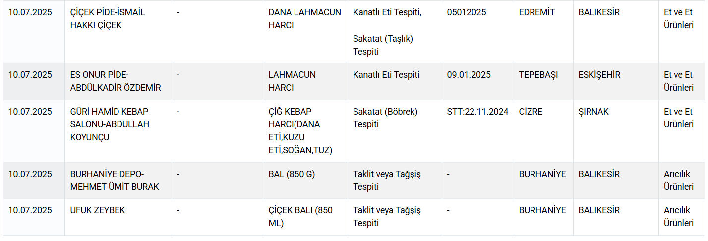 Bakanlığın 10 Temmuz’da güncellediği listede, Kocaeli’nin Çayırova ilçesinde faaliyet gösteren “Hacı Askerin Sofrası” adlı işletmenin pide harcında “tek tırnaklı eti” tespit edildi. Bu kategori, at ve eşek etini kapsıyor.