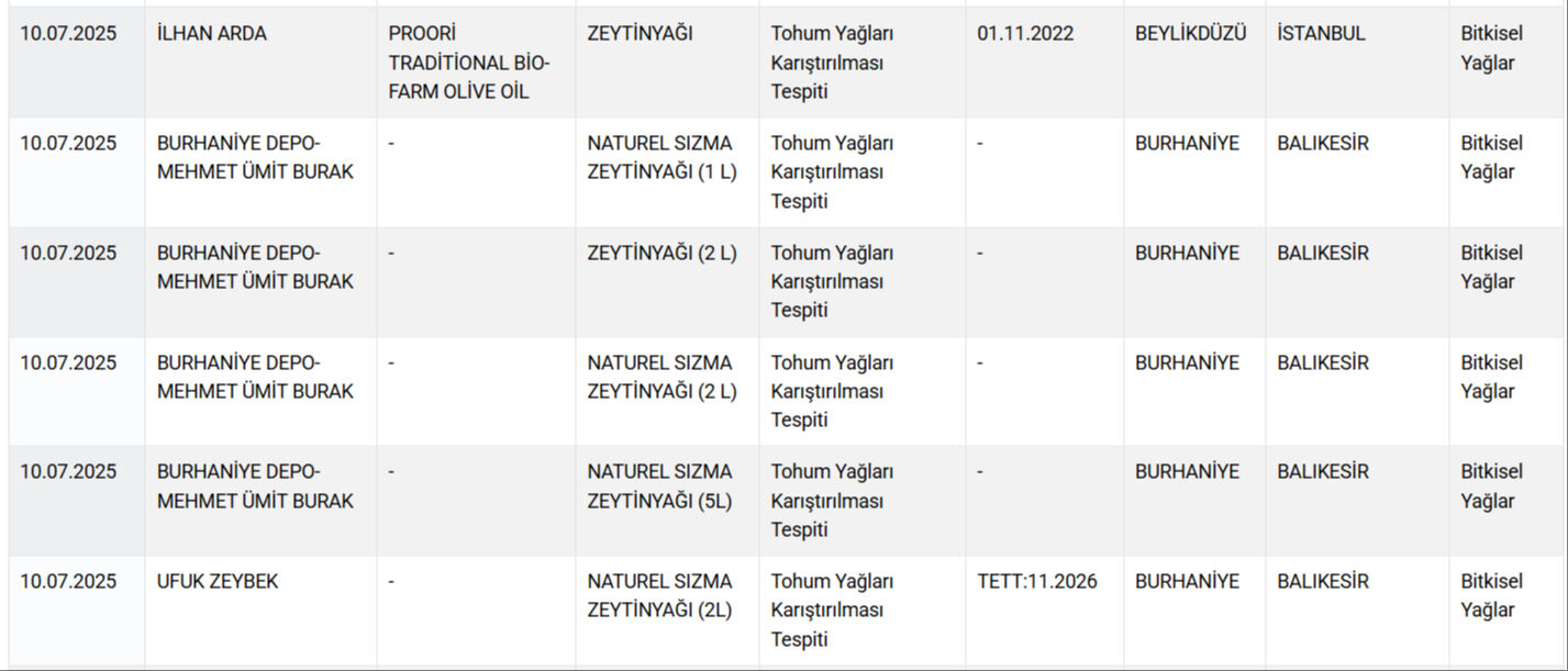 Zeytinyağında: Tohum yağları karıştırılarak ürünün saflığı bozuldu.