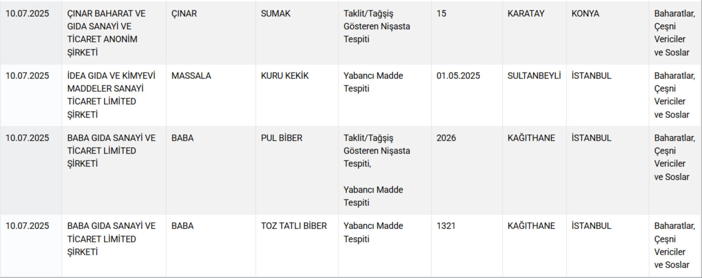 Tarım ve Orman Bakanlığı, tüketicilerin sağlığını korumak amacıyla taklit ve tağşiş yaptığı tespit edilen ürünlere yönelik güncel listeyi yayımladı. Bakanlık tarafından açıklanan listede, et ve et ürünleri kategorisinde çeşitli firmalar bulunuyor. Bu firmaların ürünlerinde insan sağlığını tehdit eden uygunsuzluklar saptandı.