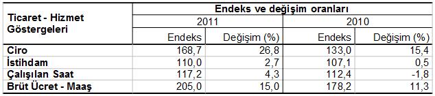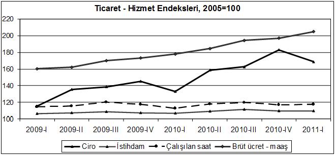 NACE Rev.2’ye göre hesaplanan 2005=100 temel yıllı, Üç Aylık Ticaret – Hizmet Ciro Endeksi 2011 yılı I. döneminde bir önceki yılın aynı dönemine göre % 26,8 artarken, bir önceki döneme göre % 7,9 oranında azalmıştır.