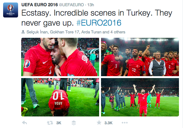 “Coşku… Türkiye’den inanılmaz sahneler. Onlar asla vazgeçmedi.” notuyla UEFA internet sitesinden Türkiye’nin sevinç fotoğraflarını paylaştı.
