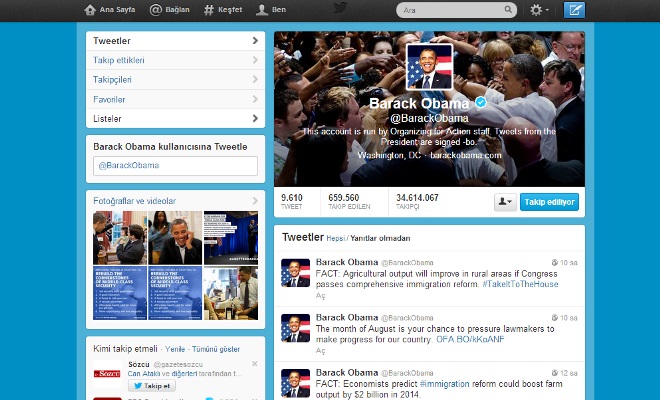 33 milyondan fazla kişinin takipçisi olarak ABD Başkanı Barack Obama twitter’da en çok takip edilen lider olarak görünüyor.
