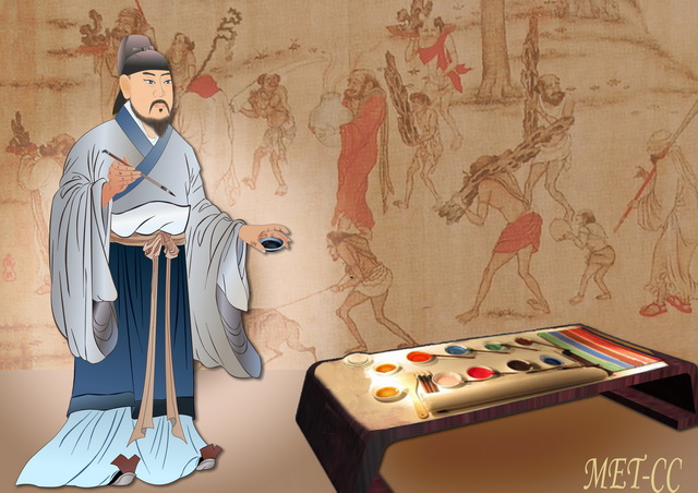 O, figürleri resmetmekte ustaydı. Onun tarafından çizilen İmparatorların ve bakanların portreleri canlı ve gerçekçiydi. İmparatoru uzun boylu ve iri yapılı tasvir ederken, gözlerindeki sağlam kararlığı da yansıttı. İmparatorun poz ve el hareketlerini yakalamak için basit çizimler kullandı. Bakanların resimlerine gelince, onları canlı, her birini kendi şekil, görünüş, kıyafet, yaş ve yüz ifadeleri ile canlandırdı.
