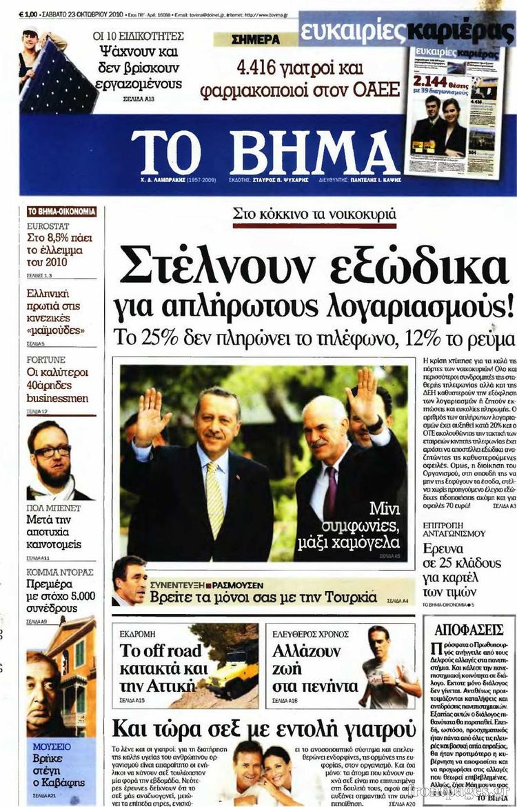 “Kısa sürede çözüm beklemeyin” başlıklı haberinde To Vima gazetesi, Erdoğan-Papandreu arasında uzun bir görüşme yapıldığı ancak görüşme sepetinin küçük tutulduğu değerlendirmesinde bulundu.
